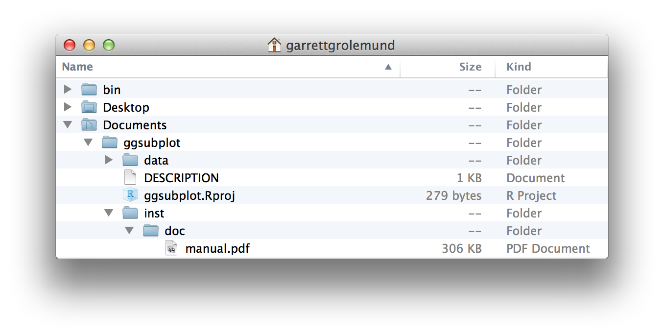 You can see your file system by opening a finder window. For example, Figure 6.1 shows part of the file system on my computer. I have tons of folders. Inside one of them is a subfolder named Documents, inside of that subfolder is a sub-subfolder named ggsubplot, inside of that folder is a folder named inst, inside of that is a folder named doc, and inside of that is a file named manual.pdf.