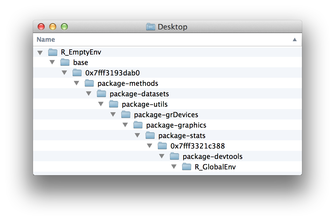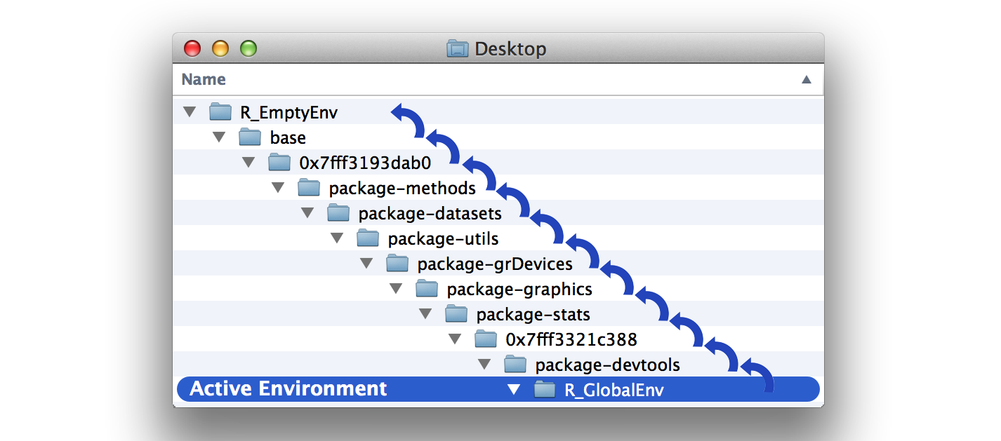 ## 12 <environment: R_EmptyEnv> "" It takes some imagination to interpret this output, so let’s visualize the environments as a system of folders, Figure 6.2. You can think of the environment tree like this. The lowest-level environment is named R_GlobalEnv and is saved inside an environment named package:pryr, which is saved inside the environment named 0x7fff3321c388, and so on, until you get to the final, highest-level environment, R_EmptyEnv. R_EmptyEnv is the only R environment that does not have a parent environment.