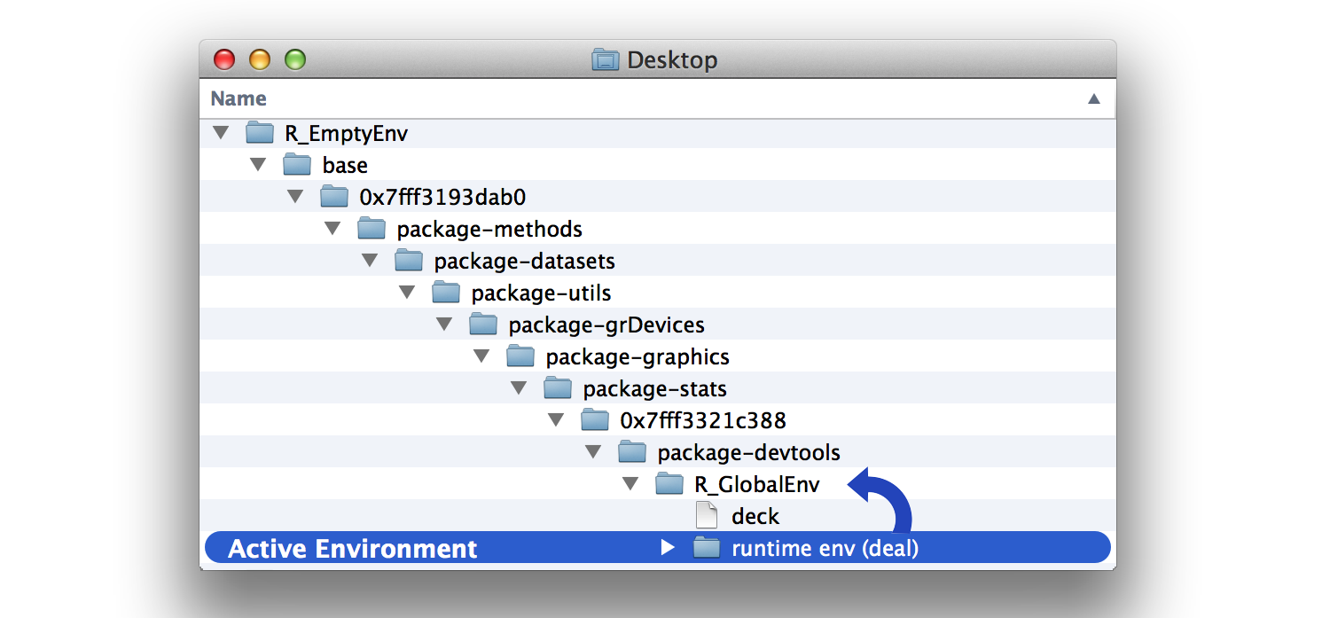 ## <environment: 0x7ff7169c3390>Why does this matter? Because now when you run deal or shuffle, R will evaluate the functions in a runtime environment that uses 0x7ff7169c3390 as its parent. DECK and deck will be in this parent environment, which means that deal and shuffle will be able to find them at runtime. DECK and deck will be in the functions’ search path but still out of the way in every other respect, as shown in Figure 6.8.