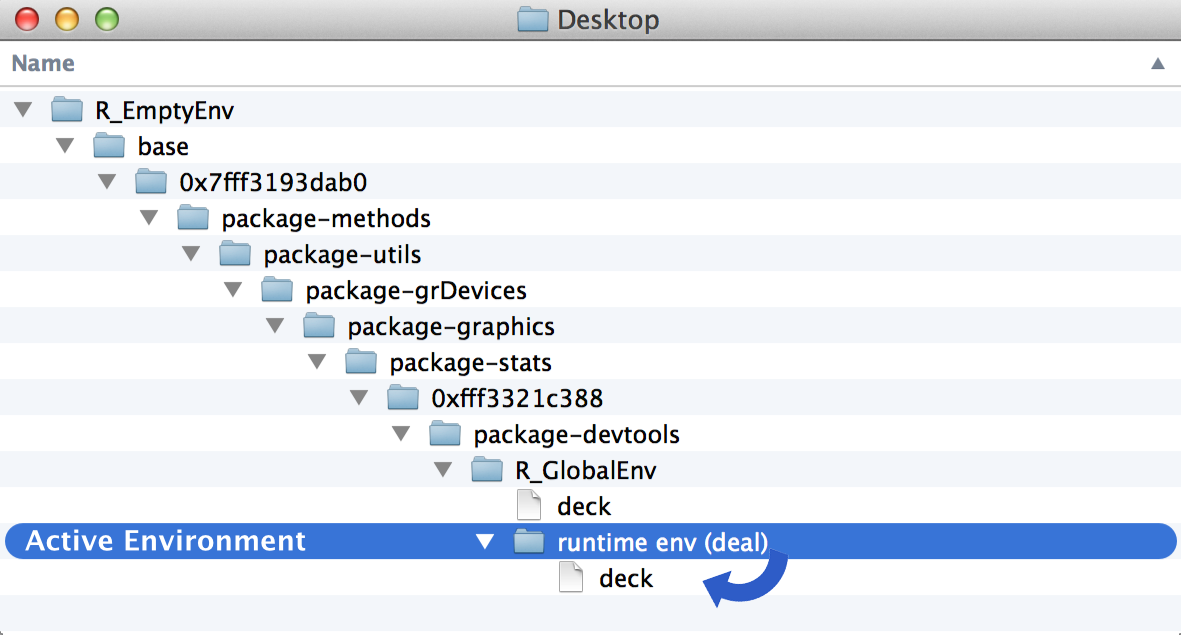 To fix these functions, you will need to learn how R stores, looks up, and manipulates objects like deck. R does all of these things with the help of an environment system.
