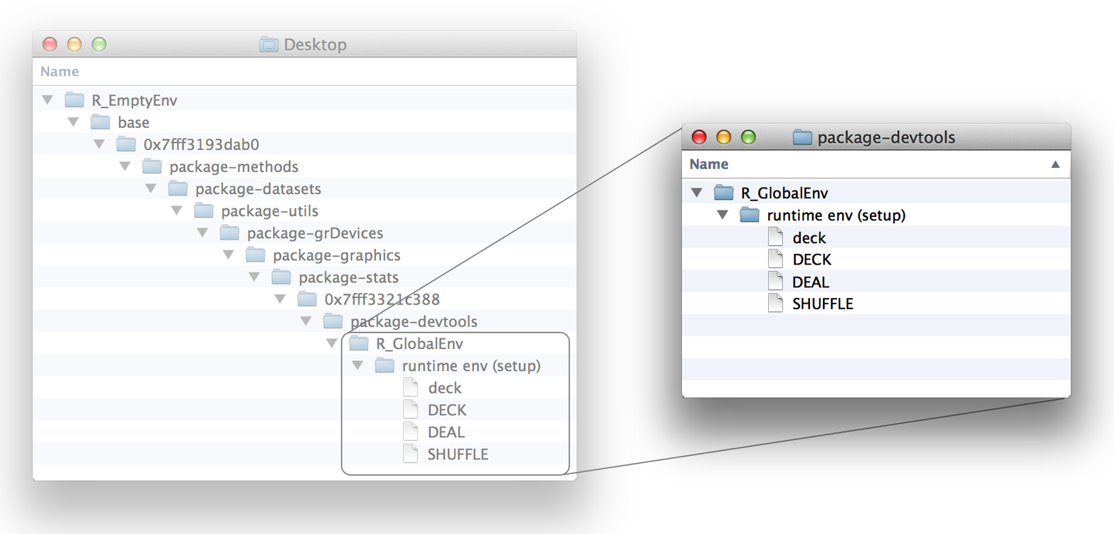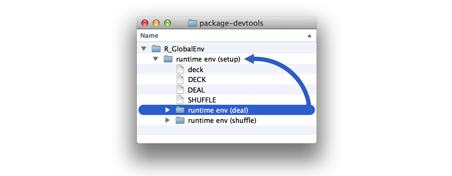 ## <environment: 0x7ff7169c3390>However, the functions now have one important difference. Their origin environment is no longer the global environment (although deal and shuffle are currently saved there). Their origin environment is the runtime environment that R made when you ran setup. That’s where R created DEAL and SHUFFLE, the functions copied into the new deal and shuffle, as shown in: