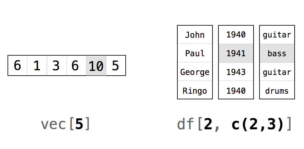 R’s notation system is not limited to data frames. You can use the same syntax to select values in any R object, as long as you supply one index for each dimension of the object. So, for example, you can subset a vector (which has one dimension) with a single index: