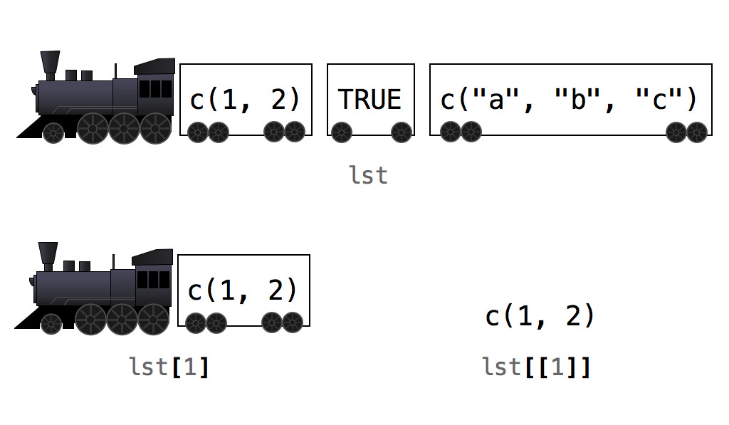 ## 1 2This difference is subtle but important. In the R community, there is a popular, and helpful, way to think about it, Figure 4.3. Imagine that each list is a train and each element is a train car. When you use single brackets, R selects individual train cars and returns them as a new train. Each car keeps its contents, but those contents are still inside a train car (i.e., a list). When you use double brackets, R actually unloads the car and gives you back the contents.
