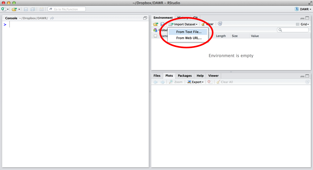 To load a plain-text file into R, click the Import Dataset icon in RStudio, shown in Figure 3.3. Then select “From text file.”