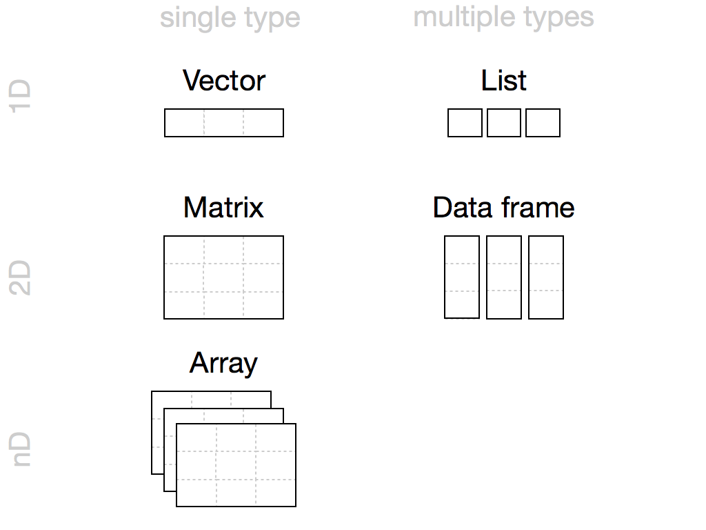 Each atomic vector stores its values as a one-dimensional vector, and each atomic vector can only store one type of data. You can save different types of data in R by using different types of atomic vectors. Altogether, R recognizes six basic types of atomic vectors: doubles, integers, characters, logicals, complex, and raw.