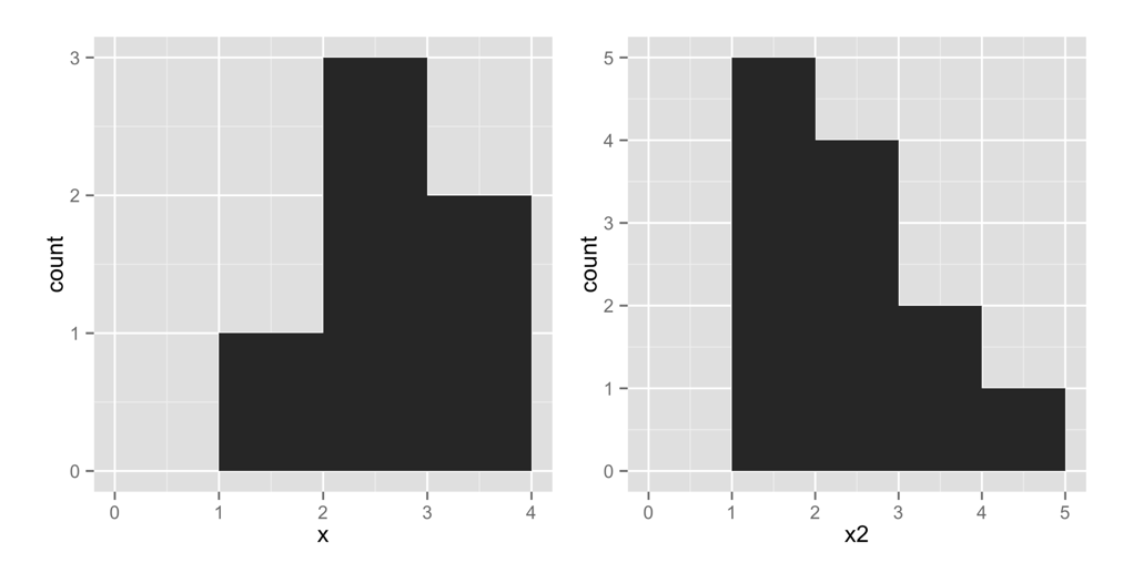 Let’s try another histogram. This code makes the right-hand plot in Figure 2.2. Notice that there are five points with a value of 1 in x2. The histogram displays this by plotting a bar of height 5 above the interval x2 = [1, 2):