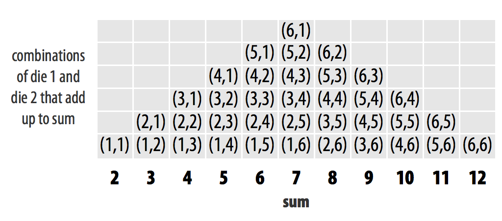 Well, if you roll your dice many times and keep track of the results, you would expect some numbers to occur more than others. This is because there are more ways to get some numbers by adding two dice together than to get other numbers, as shown in Figure 2.3.
