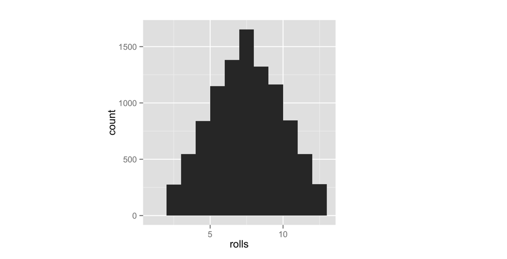 If you roll your dice many times and plot the results with qplot, the histogram will show you how often each sum appeared. The sums that occurred most often will have the highest bars. The histogram should look like the pattern in Figure Figure 2.3 if the dice are fairly weighted.