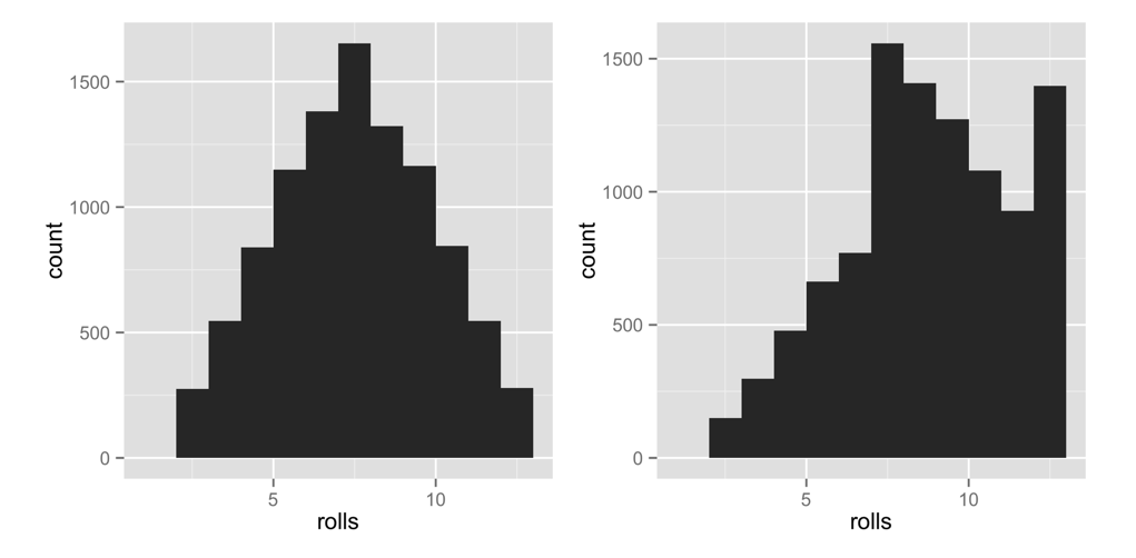 qplot(rolls, binwidth = 1)This confirms that we’ve effectively weighted the dice. High numbers occur much more often than low numbers. The remarkable thing is that this behavior will only be apparent when you examine long-term frequencies. On any single roll, the dice will appear to behave randomly. This is great news if you play Settlers of Catan (just tell your friends you lost the dice), but it should be disturbing if you analyze data, because it means that bias can easily occur without anyone noticing it in the short run.