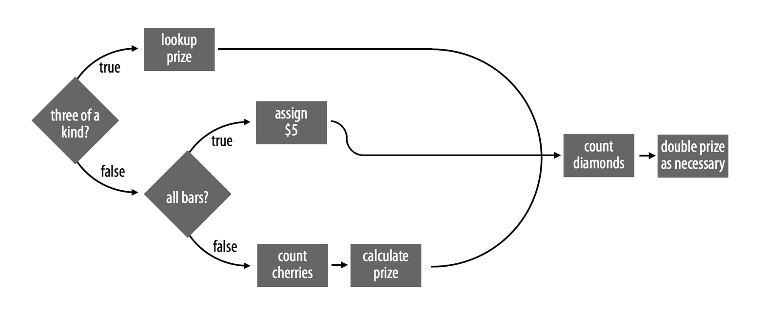 For example, score will need to calculate the prize one way if symbols contains three of a kind (In that case, score will need to match the common symbol to a prize). score will need to calculate the prize a second way if the symbols are all bars (In that case, score can just assign a prize of $5). And, finally, score will need to calculate the prize in a third way if the symbols do not contain three of a kind or all bars (In that case, score must count the number of cherries present). score will never use all three of these algorithms at once; it will always choose just one algorithm to run based on the combination of symbols.
